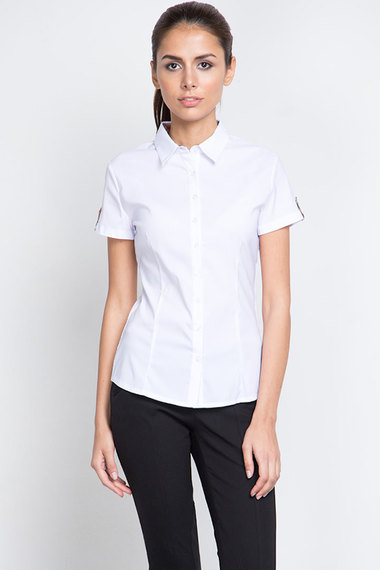 ОписаниеБелая блузка с короткими рукавами, сшита из хлопковой ткани с добавление полиэстера. Интересные детали: манжеты рукавов и внутренняя часть воротника украшены клетчатой ткань с модным принтом.